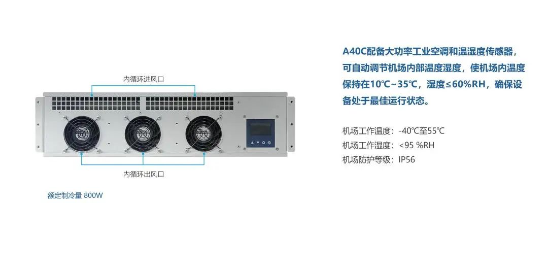為了確保無人機和充電設備在高溫或低溫環(huán)境下穩(wěn)定運行,A40C配備了大功率工業(yè)空調和溫濕度傳感器,可以將設備內的溫度控制在10℃至35℃,濕度保持在60%RH以下,在高寒地區(qū)或者夏季酷熱的環(huán)境下也能穩(wěn)定高效地完成巡檢任務。