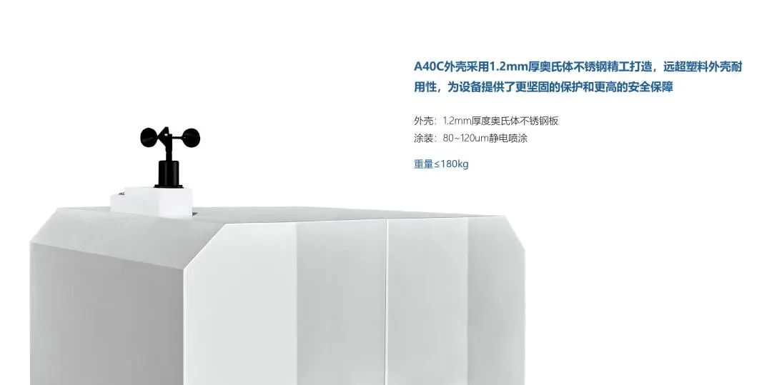 A40C采用1.2mm厚的奧氏體不銹鋼外殼,比傳統(tǒng)塑料外殼更具耐用性,能為設備提供更強的物理保護,搭配整機IP56防護等級,有效防水防塵,適合野外長期的無人值守作業(yè),減少設備維修頻率和更換成本。