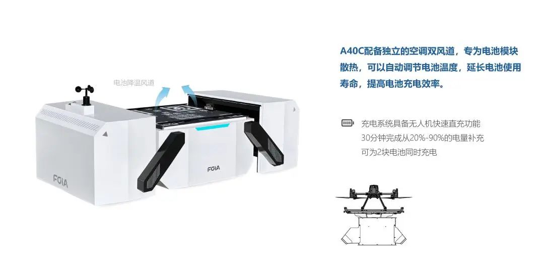 在“智能空調”和快速直充功能的加持下,A40C可為2塊電池同時充電,在30分鐘內將無人機電池從20%充至90%,顯著縮短減少充電等待時間,盡快恢復無人機作業(yè)能力,提高任務執(zhí)行效率。