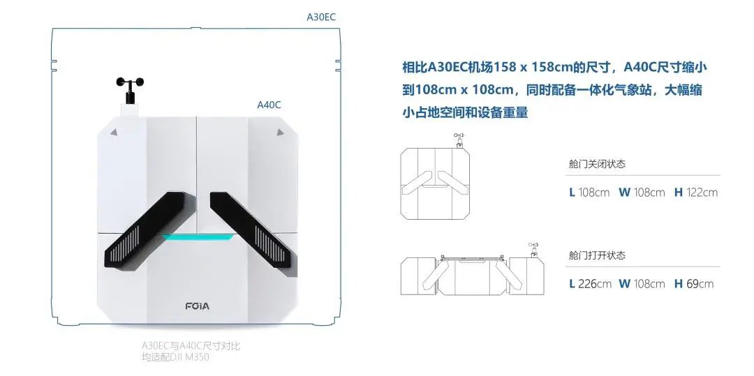 智方A40C的尺寸縮小至108cm x 108cm,比前代A30EC機場減少了約53%的占地面積,極大地提升選址部署的靈活性。