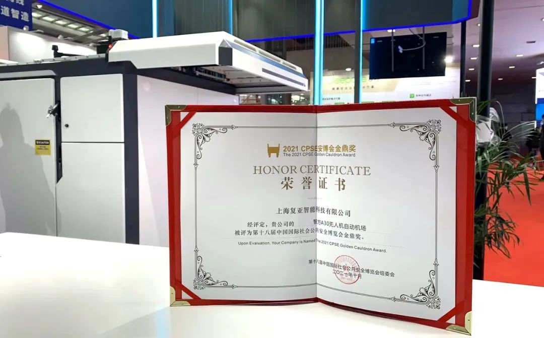 復亞智能攜智方A30固定式無人機機場和智方S10小型無人機機場亮相展位,向到場領導、行業(yè)專家及與會觀眾展現(xiàn)無人機全自動巡邏巡檢系統(tǒng)在公共安全行業(yè)的價值與前景,獲得安博會最高榮譽獎“金鼎獎”以及“2021中國智慧城市建設推薦品牌”。